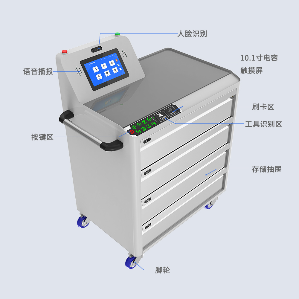 智能RFID工具车,运用RFID技术革新对工具精细化管理,该系统自动记录工具进出,精准高效,省去人工登记的繁琐与误差。