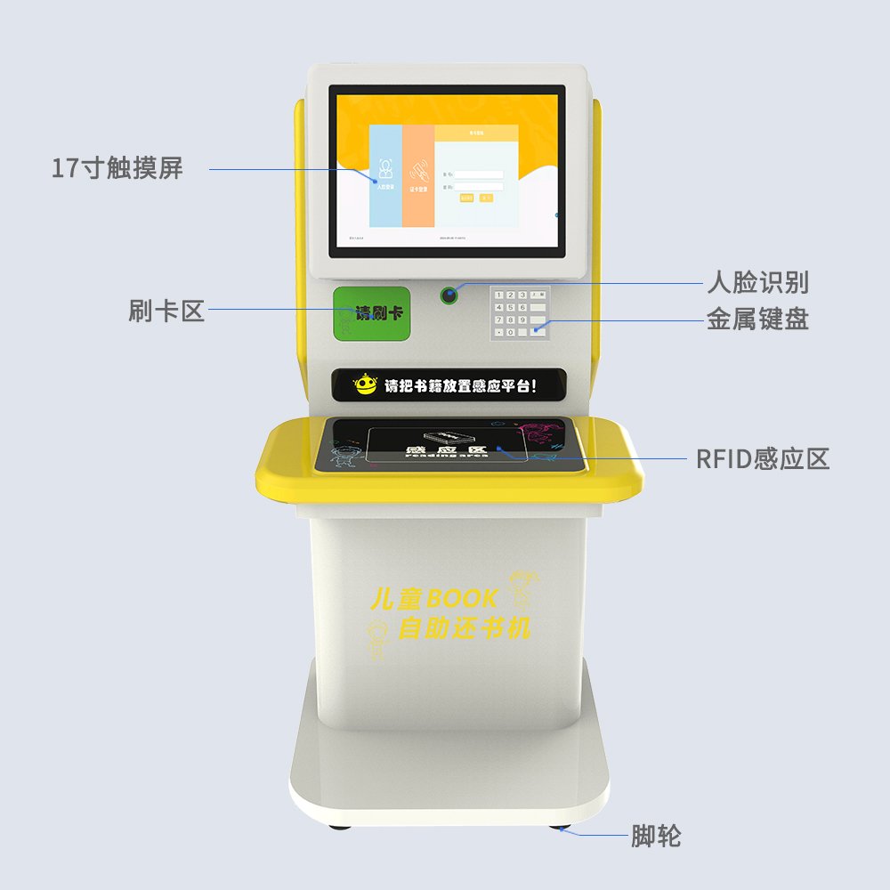 针对儿童设计的自助借还机,集成RFID识别技术,让儿童更便捷快速借还书箱,系统支持同时读取多本图书。人性化的圆弧设计防碰撞。支持人脸识别、刷卡识别,简化借还流程。