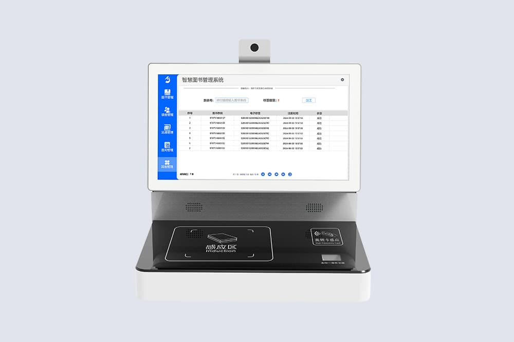 RFID智能工作站(館員工作站)用于近距離標簽讀取與業務操作的結合,適用于需要人工參與處理的工作場景。設備通常部署在桌面或服務臺,用于完成標簽識別、信息錄入及數據交互等操作。